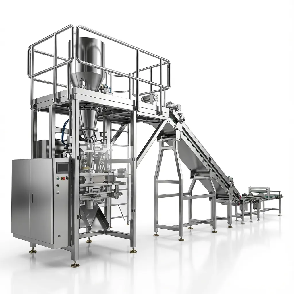 The VFSt10 secondary packaging machine is a fuly automatic wertical flling and seaing machine, specifically designed to automati-cally pack the products dischargod from the upstream vertical pacianging machine into PE main bags formed by rollfin, This devicoimproves packaging production efhicienoy and product quality through highy aitoenated operations and is widely used in thesecondary packaging process of industries such as sugar, salt, four, laundry detergent, fertilizers, and food